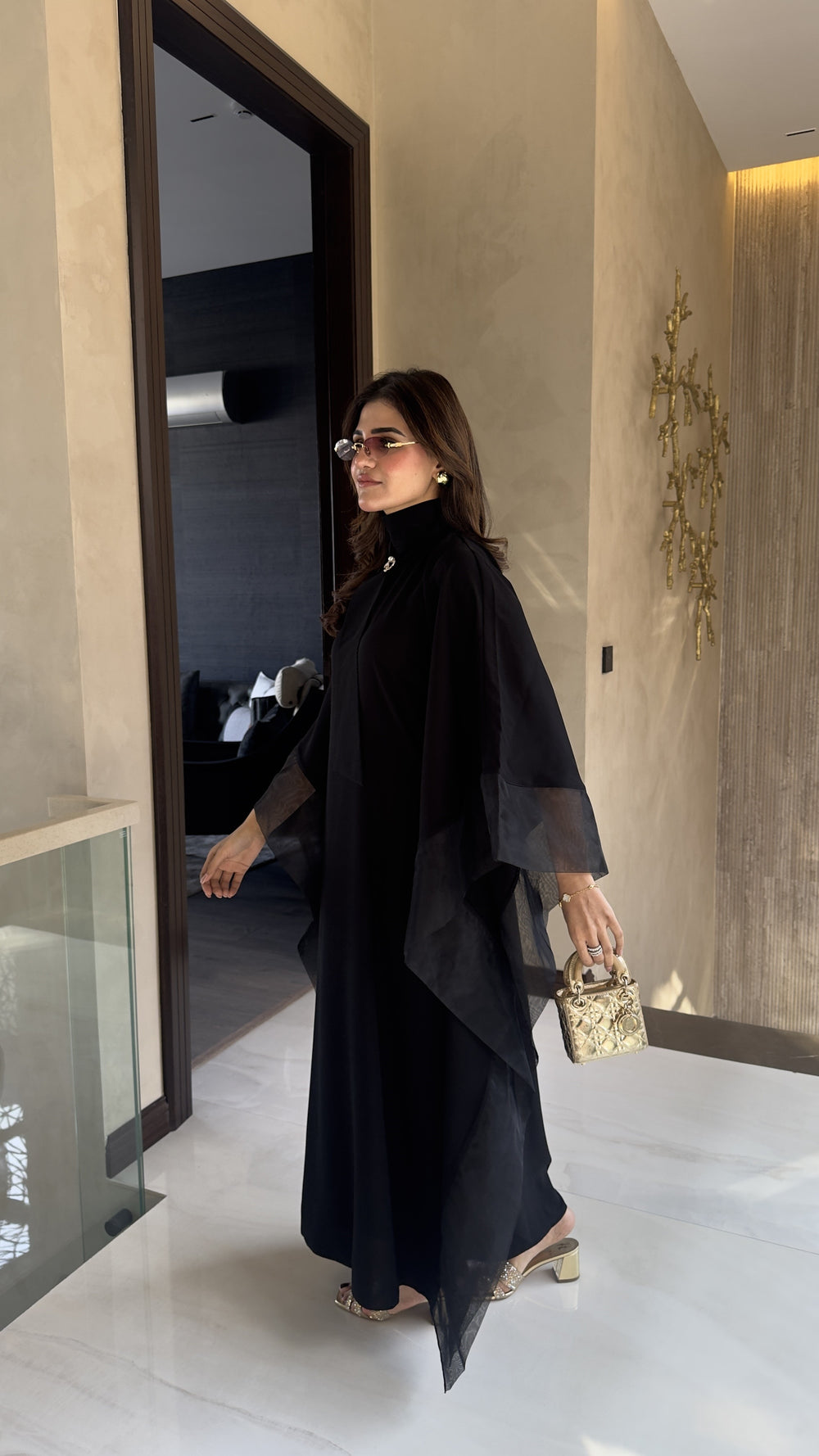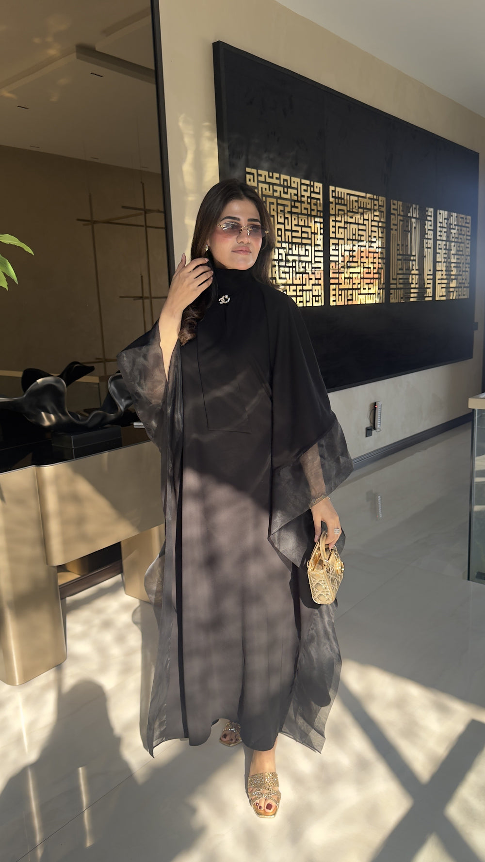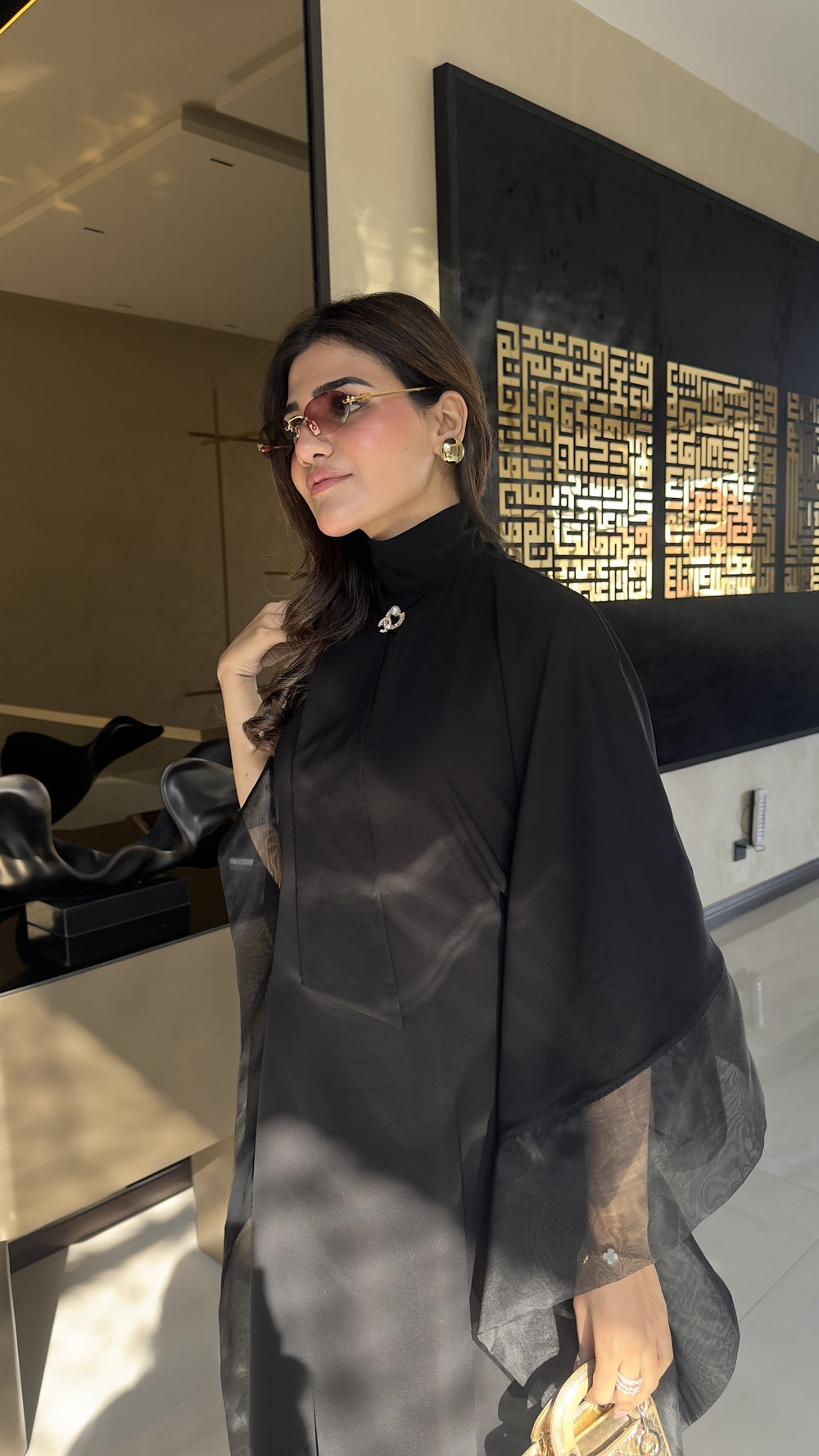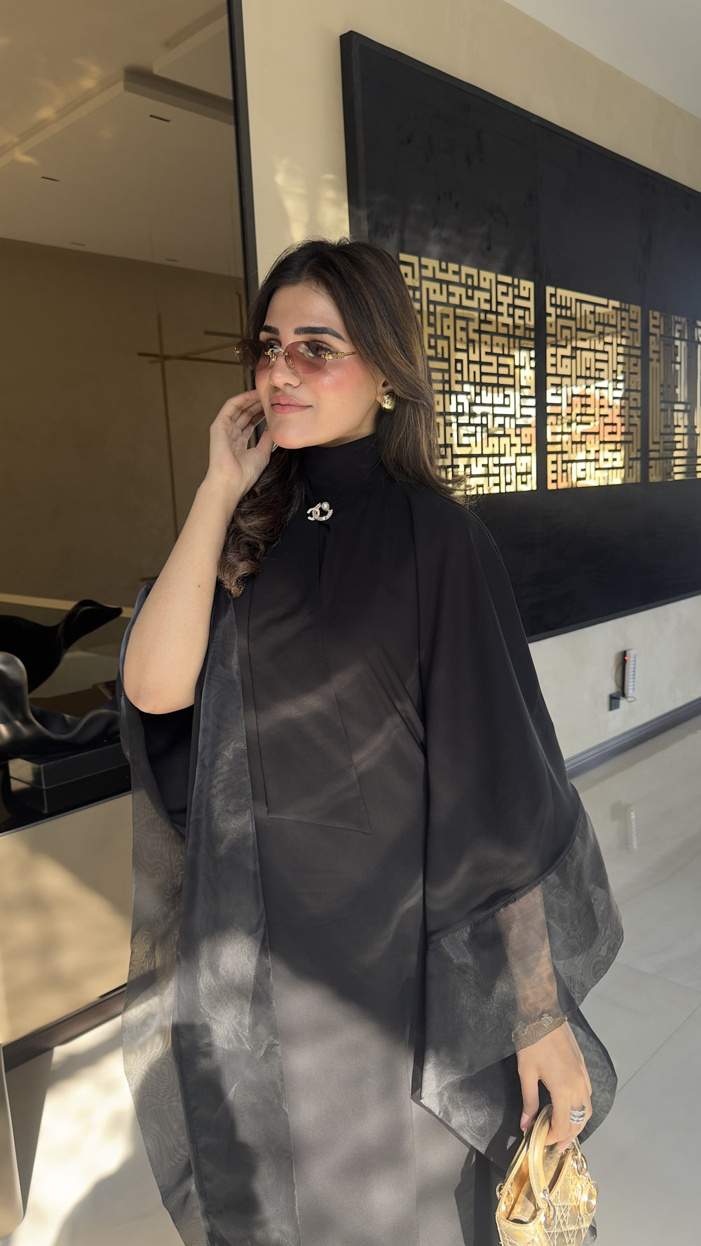 The Elara Noir Abaya combines luxury and elegance, crafted from premium soft nida for a smooth, comfortable feel. The sides feature pure organza, adding a subtle sheen, while a Chanel-inspired brooch enhances the timeless design. The draped neck creates a flattering silhouette, and the flowing fabric ensures effortless movement.