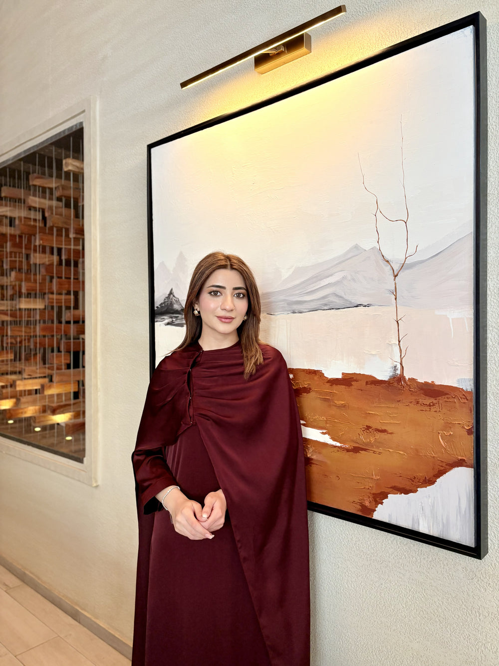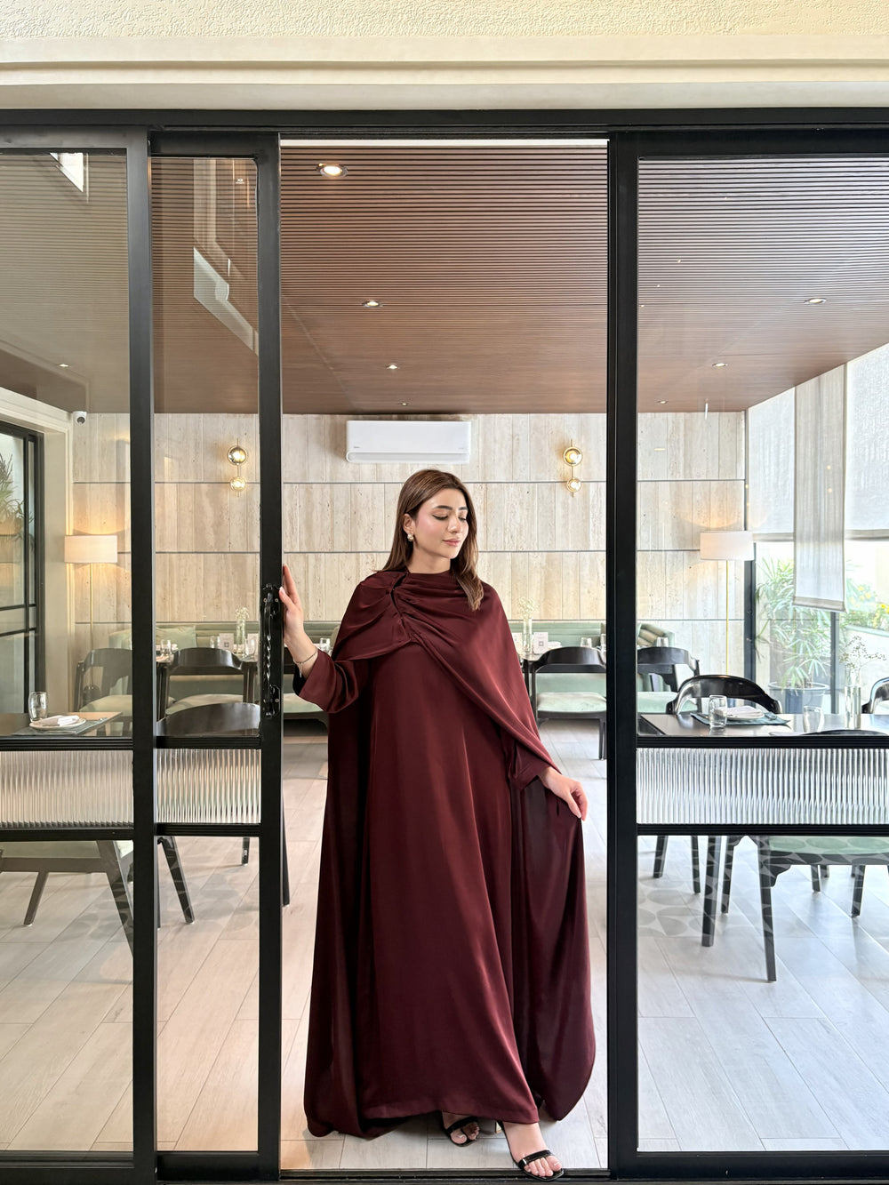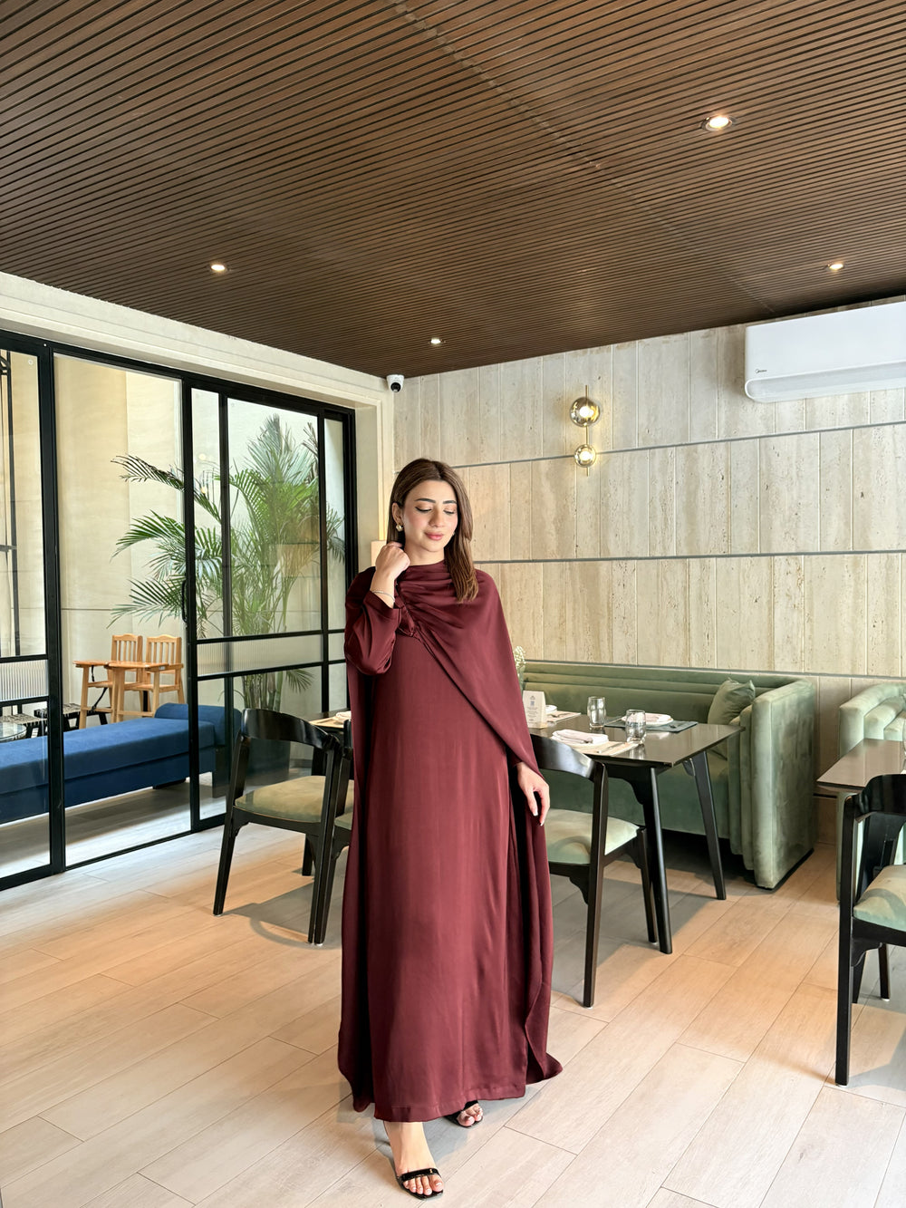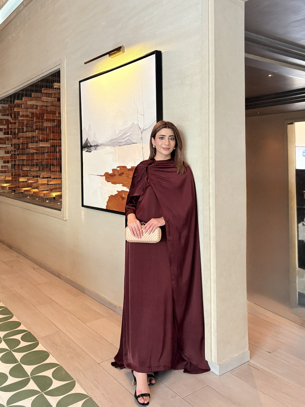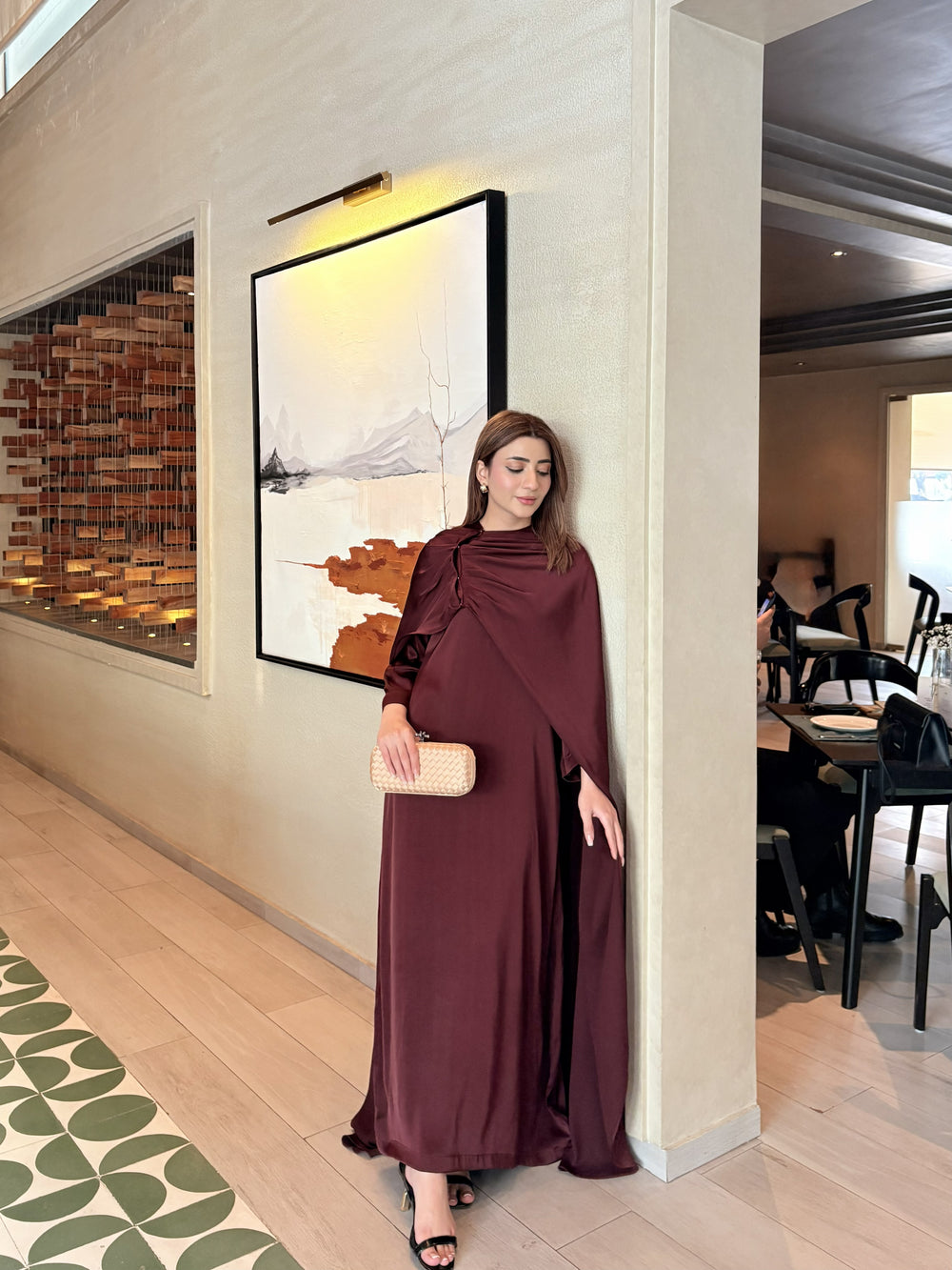 The Liora dress is a stunning fusion of elegance and contemporary design, crafted from premium silk for a luxurious, smooth feel. The dress features a flowing cape with pleats on the sides, adding dimension and movement to the design. Paired with a matching inner dress, this piece offers both comfort and sophistication. The silk fabric provides a soft, lustrous finish, while the pleated cape adds a dramatic, yet refined touch.