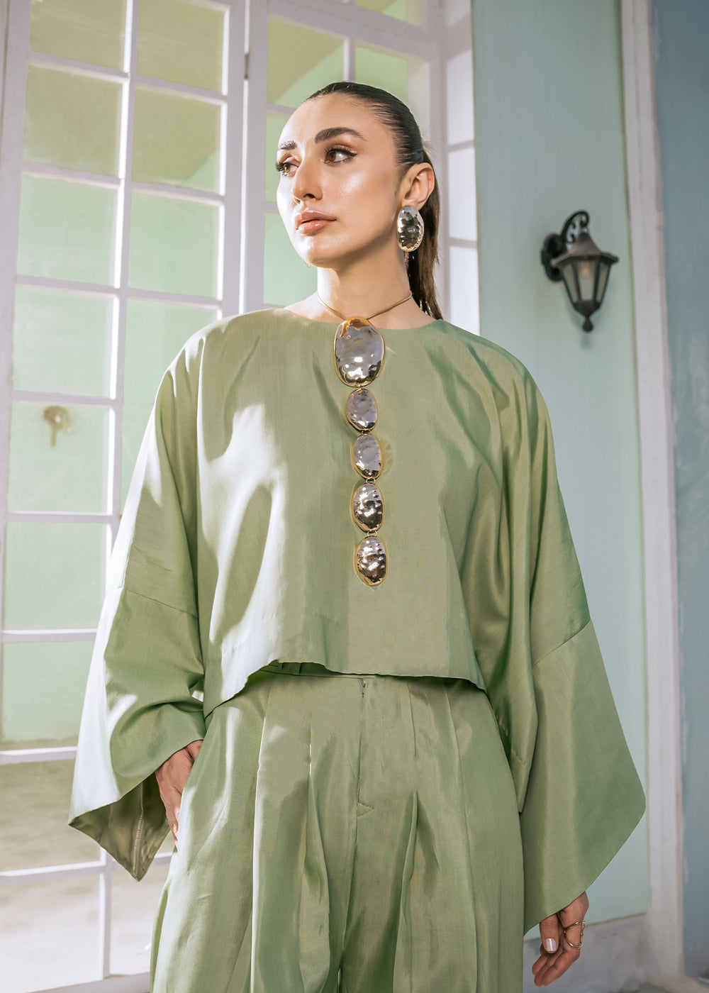 Minimal meets majestic in this relaxed-fit sage green co-ord set, crafted for days when ease and elegance go hand in hand. The flared sleeves, structured wide-leg pants, and boxy top silhouette make it a versatile addition to your wardrobe — whether you're dressing up for a lunch or layering it for a night out.
