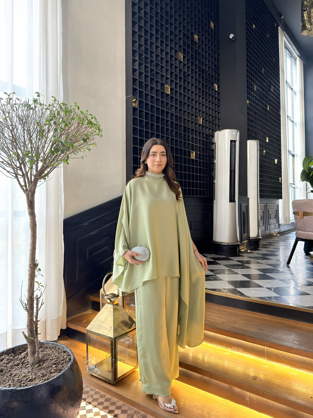Soft Swell – Crystal Sage is a luxurious silk co-ord set designed for those who seek understated elegance. The set features delicate pearl and gem work on the collar, adding a refined touch of glamour. The diamond-esque lace detailing on the armholes elevates the piece with intricate craftsmanship, while the flowing silk fabric offers both comfort and grace. The soft green hue, Crystal Sage, brings a sense of tranquility and natural beauty, making it the perfect choice for special occasions where sophistication is key.
