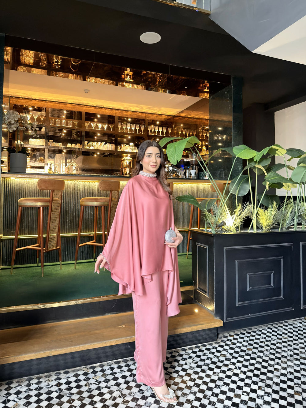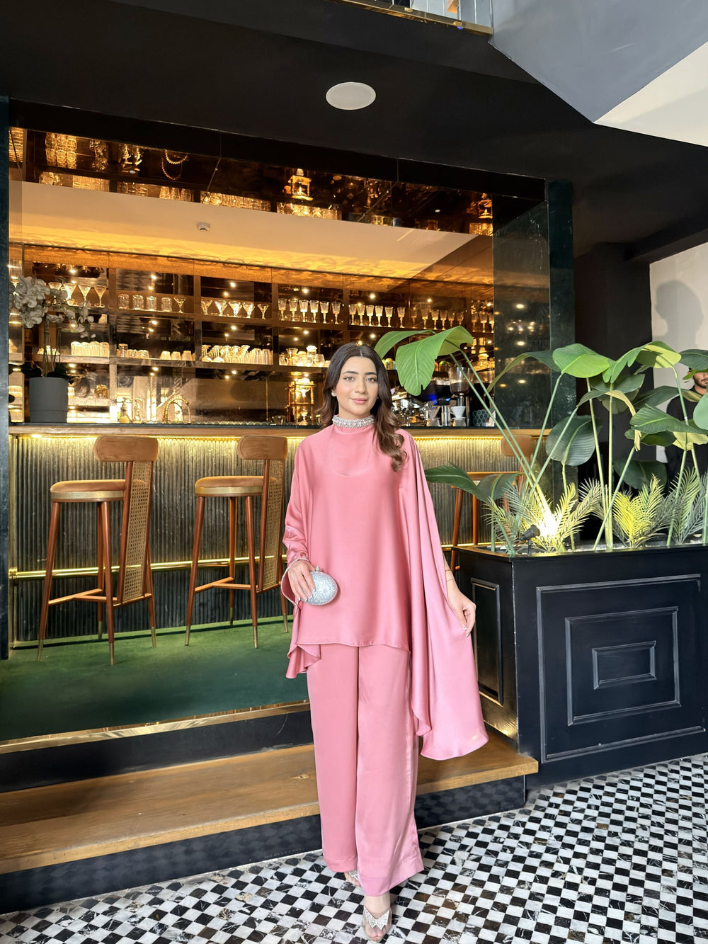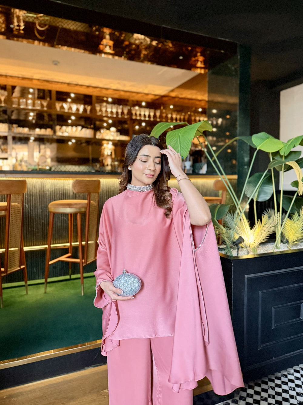 Soft Swell – Rose Quartz is a luxurious silk coord set designed to exude elegance with every movement. The set features delicate pearl and gem work on the collar, adding a touch of refined glamour. The diamond-esque lace detailing on the armholes enhances the sophisticated allure, while the flowing silk fabric offers both comfort and grace. The asymmetrical top and wide-leg trousers create a soft, flattering silhouette, perfect for any special occasion.